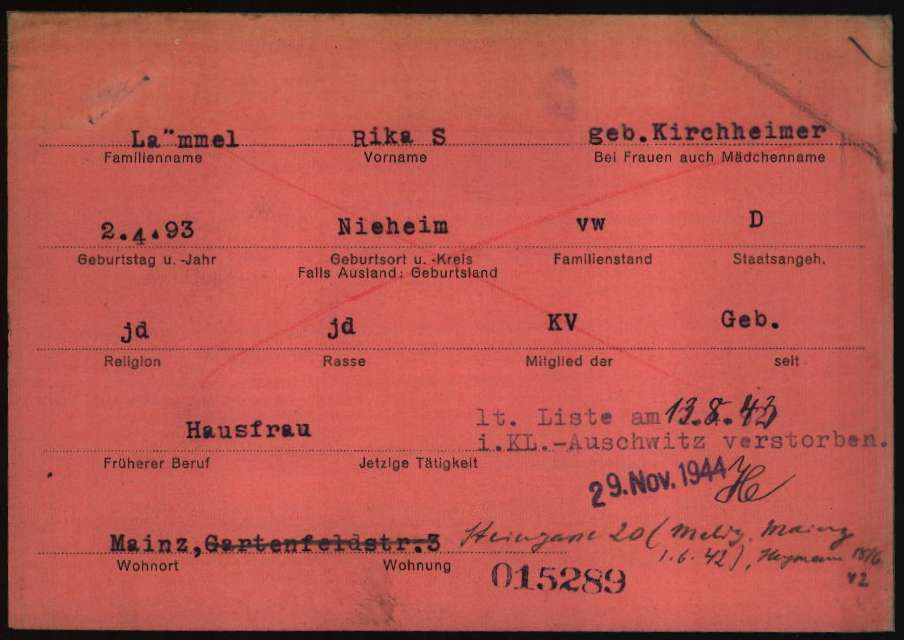 Rieke Kirchheimer, 1893 im westfälischen Nieheim geboren, war verheiratet mit dem evangelischen Ingenieur Hermann Wilhelm Max Lämmel, 1884 im Sächsischen Waldheim-Massanei geboren. Aus der Ehe der beiden gingen die Kinder Hella, 1916 geboren, und Gerd, 1920 geboren, hervor. Die Familie war in der Mainzer Rheinallee 12 ansässig.